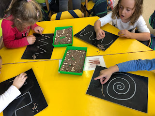 En aquest context de treball més sistemàtic i específic és on els alumnes, amb la guia de les seves mestres, creen un espai d’aprenentatge que reuneix les condicions per assolir l’organització de l’espai gràfic, la direccionalitat, la lateralitat, la coordinació de l’ull amb la mà, la força i la destresa de les mans a l’hora de fer servir un estri per a fer realitzacions gràfiques i, en definitiva, escriure.